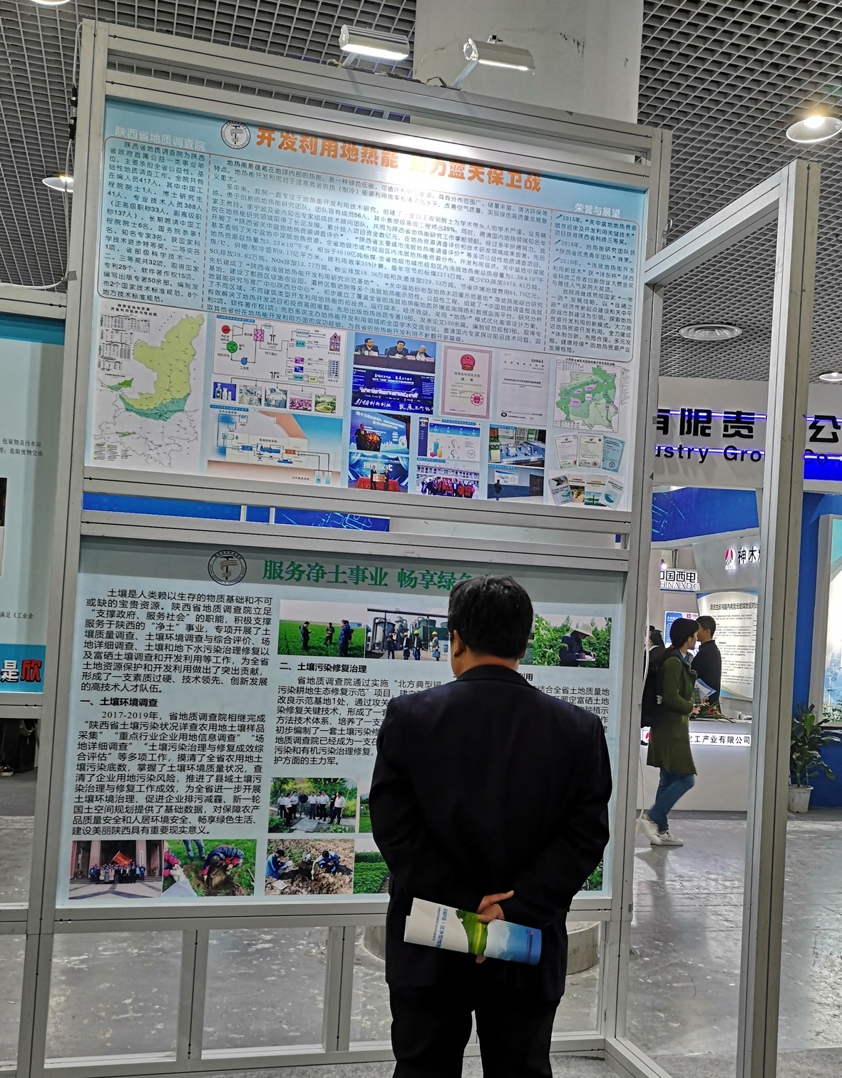 此次展會上,由陜西省水工環地質調查中心的地熱地質調查所和化探地質調查所分別制作以“開發利用地熱能 助力藍天保衛戰”及“服務凈土事業 暢想綠色生活”為題的兩塊展板展出。展會期間,有多家單位和個人前來了解有關地熱地質工作和土壤治理相關專業知識和主要進展,我單位現場工作人員都予以詳細解答。通過參加此次展會,不僅助推了“綠色發展、綠色生活”的展會主題,同時較好地宣傳了我中心在相關領域的業務水平和工作成果。